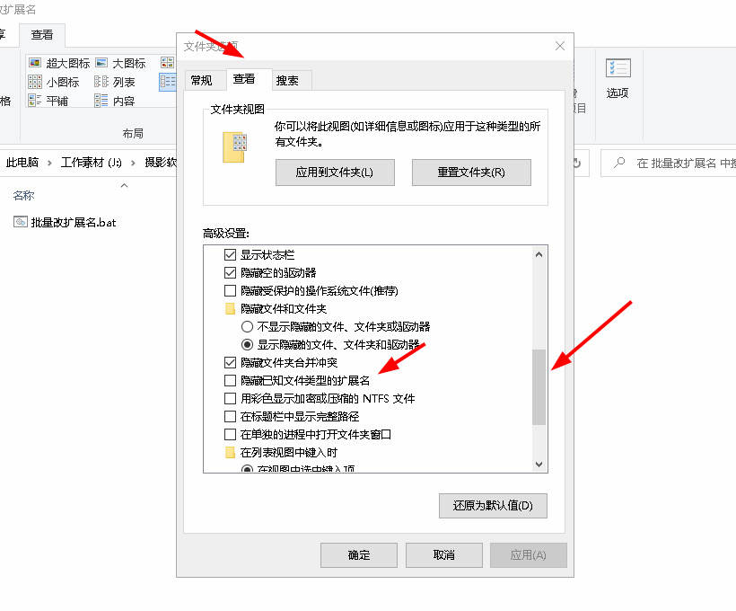 第二步:在弹出来的“ 文件夹选项 ” 中,找到“ 查看 ” 标签页,然后下拉,就可以看到 “ 隐藏文件类型的扩展名 ” ,只要不勾选,即是关闭。