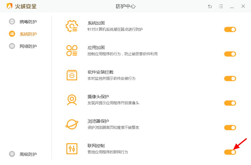 2.找到系统防护中的联网控制,先点击图中箭头指向的开启按钮,然后再点击联网控制。