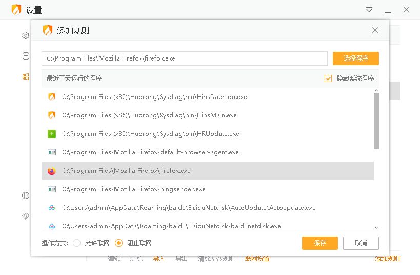4.点击“添加规则”后,会出现一个窗口,在这个窗口里,可以主动选择需要的程序进行“允许联网”或“阻止联网”操作。