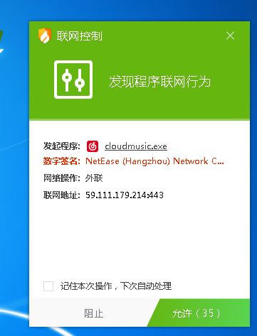 6.完成第五步后我们直接打开任意一个软件,会有联网提示,先勾选“记住本次操作,下次自动处理”,然后按照你的需求选择“阻止”或“允许”。