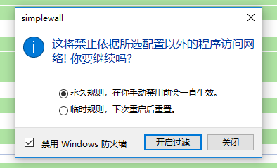 最后,特别需要注意的是,即使 SimpleWall 被关闭,已制定的联网规则也能正常工作,同理,如果未来你不想用这款软件了,一定要点击【关闭过滤】之后,再删除这款软件。