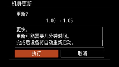 3.相机屏幕会显示更新前后的固件版本号,及升级注意事项。请在阅读之后,点击[执行],升级开始。