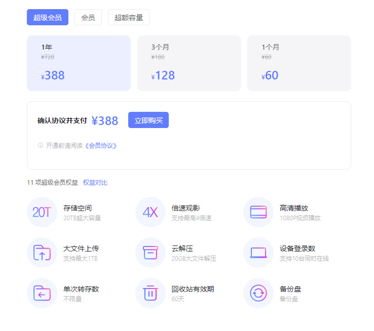 就此,阿里云盘又回到了我的视线中,跑去看了一下价格,会员价格是1年388元,相比百度网盘1年268元(连续包年)的价格,是贵了点,但我现在的百度网盘容量也才14TB(老用户),再看看机械硬盘的价格,20TB的硬盘高达4699元,想了想,如果我只是单纯的为了备份客户的资料,还是阿里云盘比较划算。