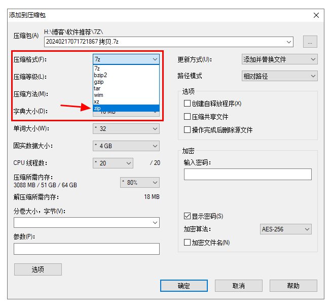 如果你想将压缩包分享给其他人,建议将压缩格式选为:zip,特别对方是非WIN系统的时候且没有安装主流解压缩软件的时候,不过放心,目前WIN系统中主流解压缩软件都支持.7Z这个格式。