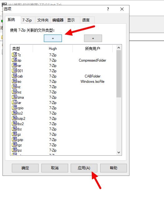 由于7Z这款软件比较守规矩,默认不会将你的所有压缩包格式关联,所以第一次安装的时候可能连桌面图标都没有,我们只需要找一个文件,右键找到7-Zip,找到添加压缩包,建立一个压缩包,然后打开7-Zip界面,找到工具-选项-系统,然后找到+号键,点击,可以看到关联了所有支持的压缩包格式,最后点击应用即可(图三)